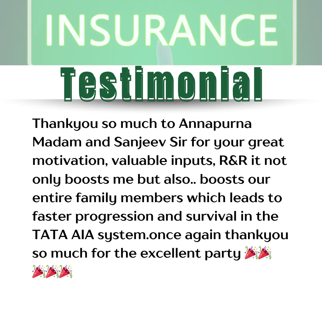 Welcome! I am a dedicated Life Insurance Business associate (Leader) at Tata AIA Life Insurance. With years of experience, I am passionate about securing your financial future through tailored life insurance solutions. My approach focuses on understanding your unique needs and goals, providing personalized service beyond policies and premiums. Whether you seek life cover, retirement solutions, or child education plans, I guide you every step of the way. At Tata AIA, we empower you with the knowledge and tools to make informed decisions, ensuring peace of mind and financial well-being. I offer a comprehensive range of services to cater to your specific requirements. From term insurance and savings plans to health coverage and retirement solutions, my goal is to provide the best options to secure your future. I provide continuous support, regularly reviewing your plans to adapt to life changes. Let's build a protected, prosperous, and worry-free future together.